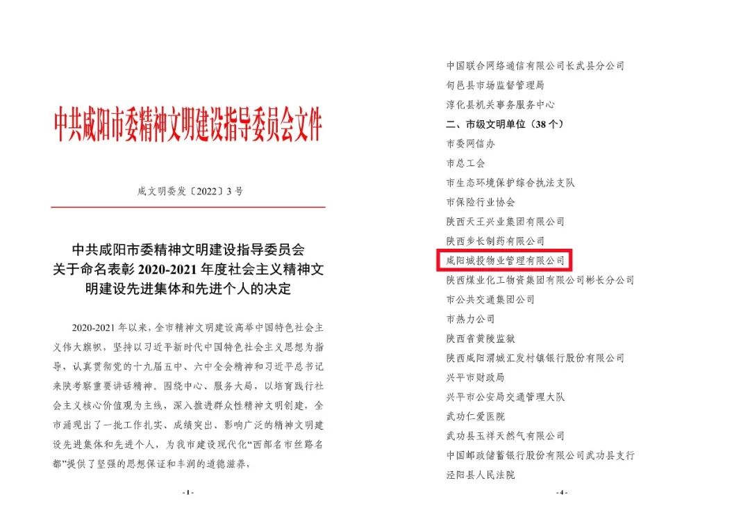 近日,從咸陽(yáng)市文明辦《關(guān)于命名表彰2020-2021年度社會(huì)主義精神文明建設(shè)先進(jìn)集體和先進(jìn)個(gè)人的決定》中獲悉,咸陽(yáng)城投物業(yè)公司被授予市級(jí)文明單位榮譽(yù)稱號(hào)。