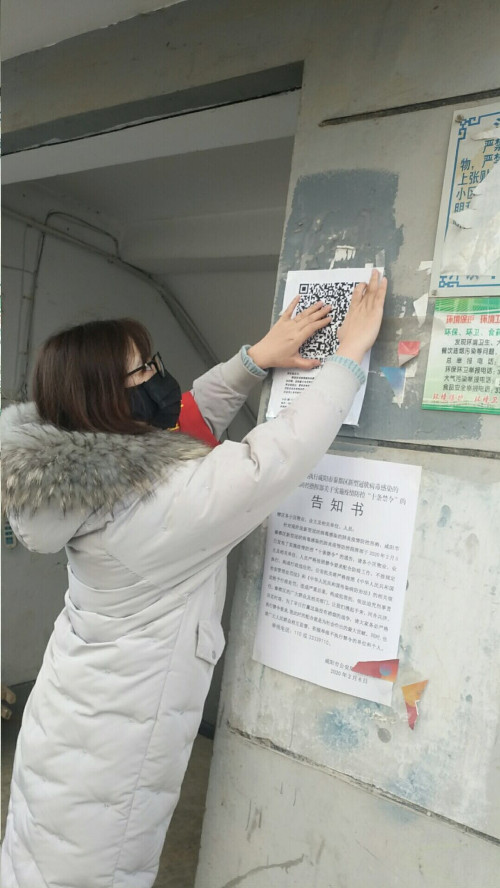 志愿者在每棟樓單元門口張貼信息填報二維碼