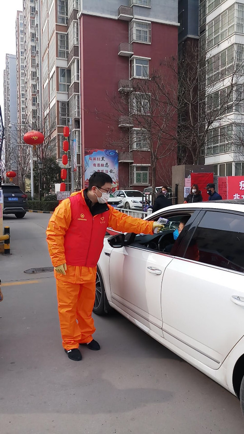 志愿者對進(jìn)入小區(qū)車輛上的司乘人員進(jìn)行測溫