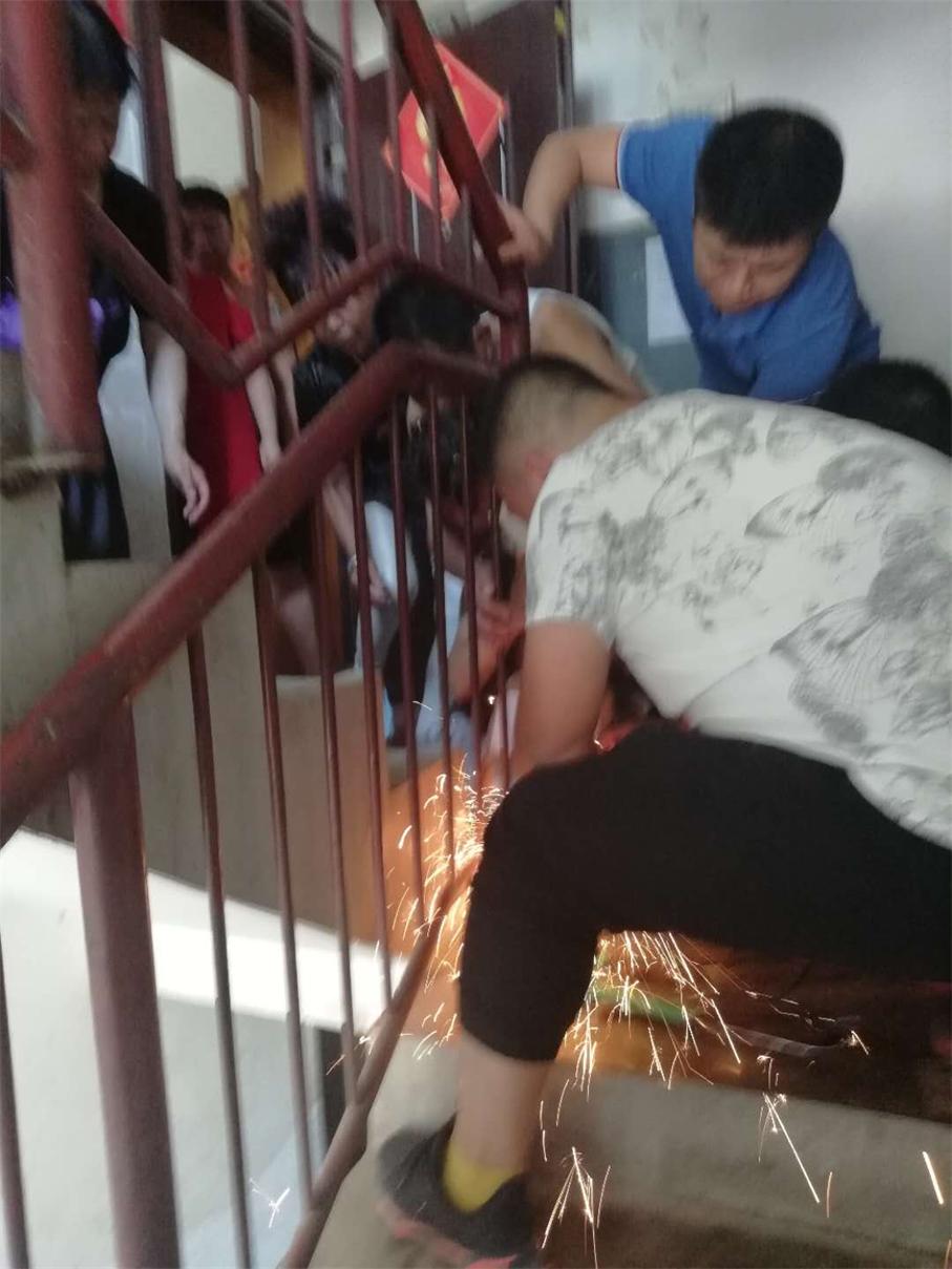 為避免孩子再次受到傷害,維修人員事先對小男孩的頭部做了適當的保護,隨后,用切割機將護欄切割開,隨著“咔嚓”兩聲輕響,一分鐘不到,欄桿鋼條兩端被割斷。5點25分,小女孩毫發(fā)未損,安全脫身。所有的人那顆懸著的心總算放了下來。