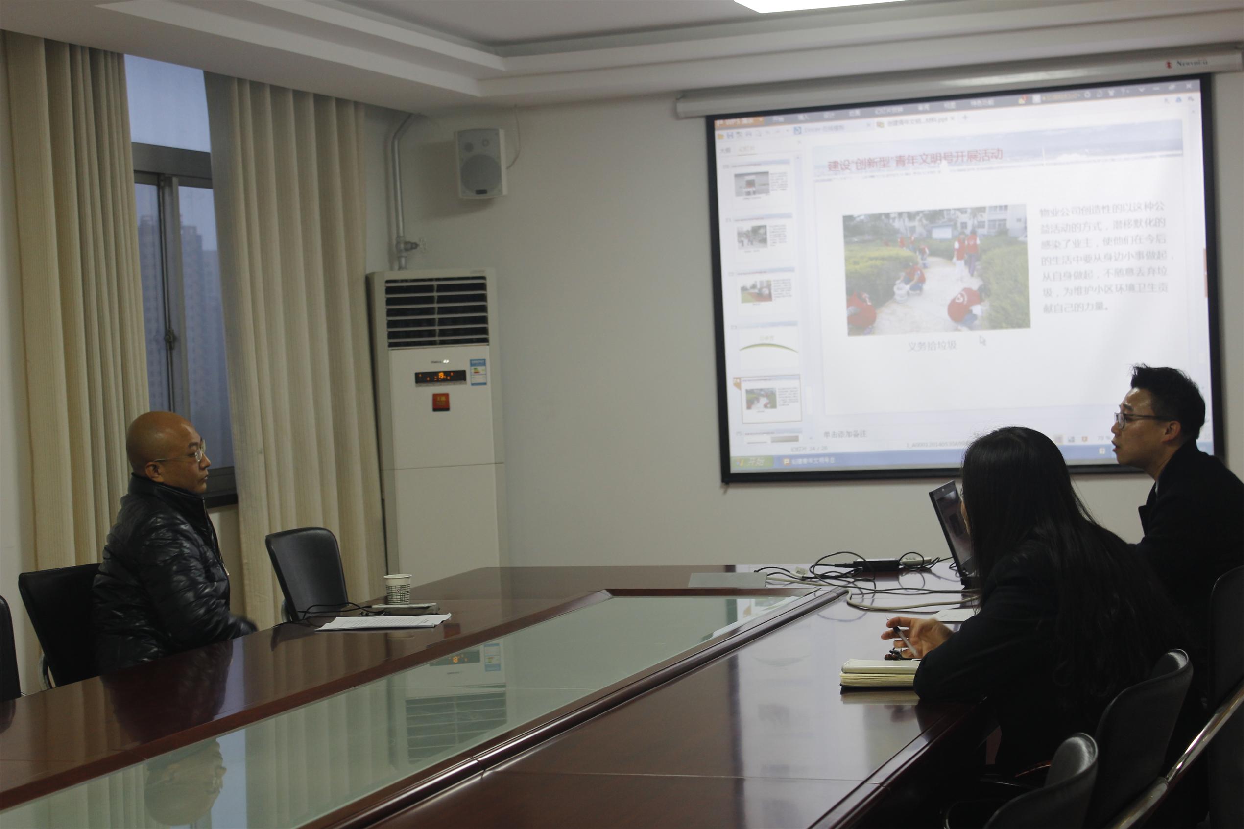 物業(yè)公司工會主席常紅艷,團支部書記王崇屾代表公司干部員工對顧李斌一行的到來表示熱烈的歡迎。隨后王崇屾代表創(chuàng)建小組向檢查組匯報了物業(yè)公司近一年來創(chuàng)建工作的開展情況,匯報后,檢查組又對物業(yè)公司創(chuàng)建工作的有關資料和宣傳設施進行了檢查。